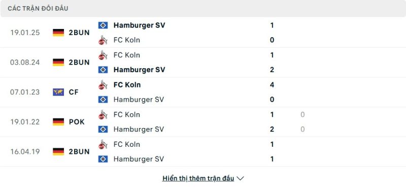 Thống kê phong độ gần đây 1. FC Köln vs Hamburger SV