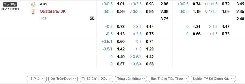 • Kèo tỷ số bóng đá hiệp 1: Ajax 1-2 Galatasaray