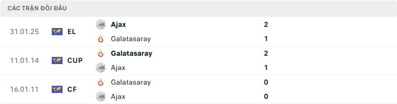 Thành tích đối đầu của Ajax vs Galatasaray