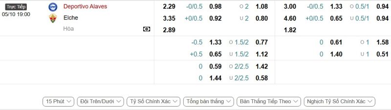 - Kèo tỷ số bóng đá hiệp 1: Alavés 0-1 Elche