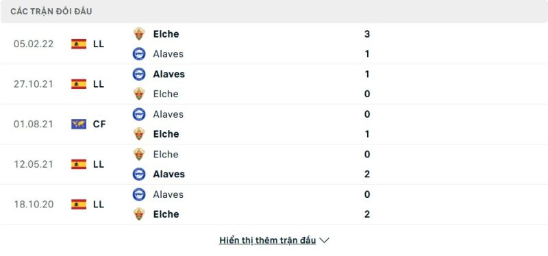 Thành tích đối đầu của Alavés vs Elche