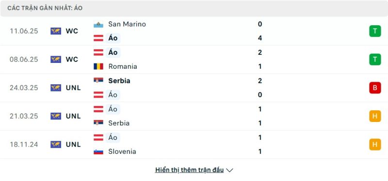 Áo đang có một khởi đầu chiến dịch vòng loại World Cup 2026 không thể hoàn hảo hơn. Sau hai lượt trận đầu tiên, họ xuất sắc giành trọn vẹn 6 điểm, chễm chệ ở vị trí thứ hai bảng H và chỉ kém đội đầu bảng về số trận đã đấu. Đoàn quân của HLV Ralf Rangnick đã thể hiện một phong độ hủy diệt khi lần lượt đánh bại Romania với tỷ số 2-1 và vùi dập đội yếu nhất bảng San Marino đến 4-0. Với hiệu số +5 và hàng công bùng nổ, họ đang cho thấy mình là ứng cử viên sáng giá cho ngôi đầu bảng.