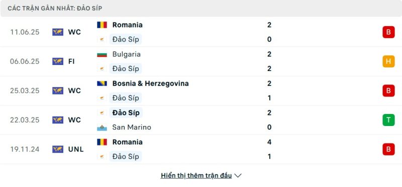 5 trận gần nhất của Đảo Síp: L-D-L-W-L