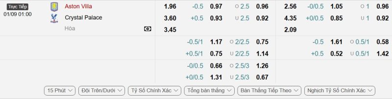 Bảng Tỷ lệ kèo bóng đá Aston Villa vs Crystal Palace