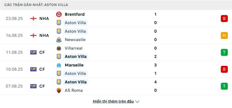 Phong độ của Aston Villa