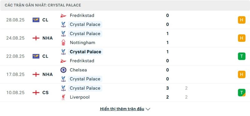 5 trận gần nhất của Crystal Palace: D-D-W-D-D