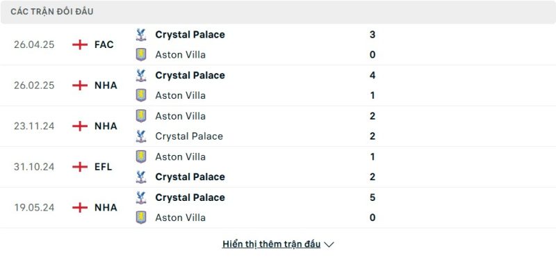 Thành tích đối đầu của Aston Villa vs Crystal Palace