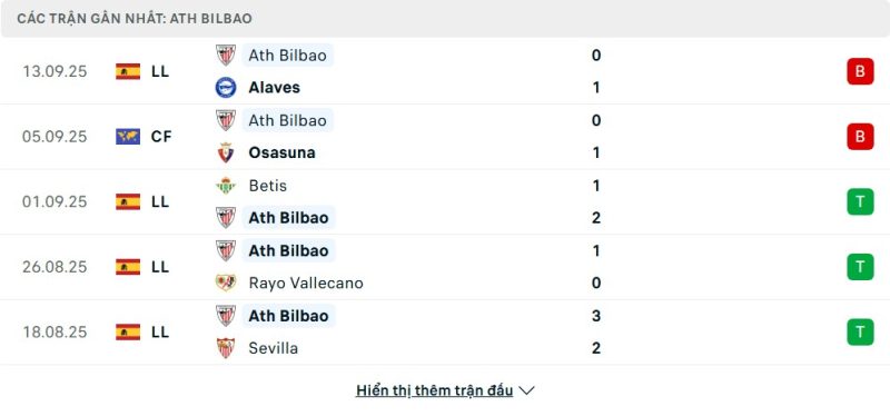 5 trận gần nhất của Athletic Bilbao: L-L-W-W-W