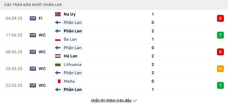 5 trận gần nhất của Phần Lan: L-W-L-D-W
