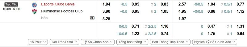 Bảng Tỷ lệ kèo bóng đá Bahia vs Fluminense