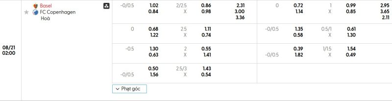 Bảng Tỷ lệ kèo bóng đá Basel vs Copenhagen