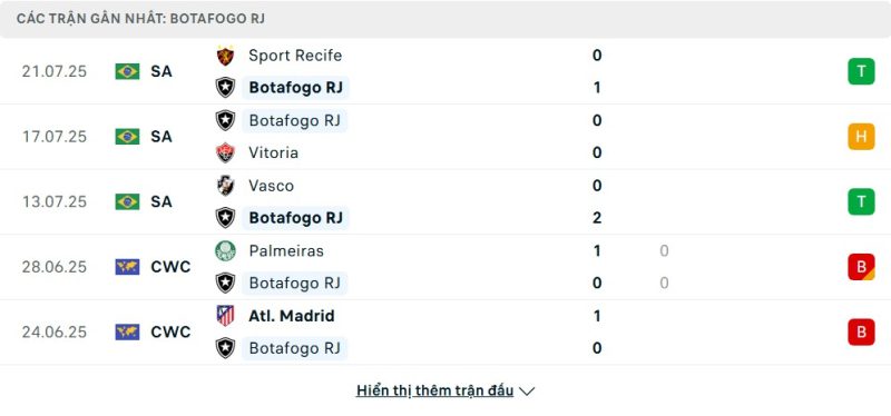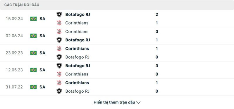Thống kê phong độ gần đây Botafogo vs Corinthians