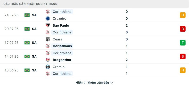 5 trận gần nhất của Corinthians: D-L-W-L-D