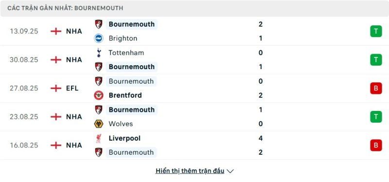 5 trận gần nhất của Bournemouth: W-W-L-W-L