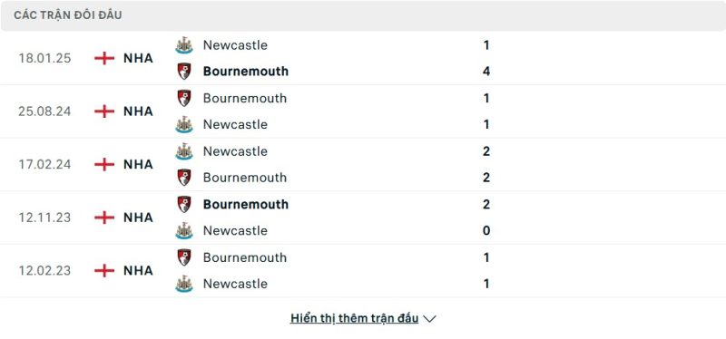 Thành tích đối đầu của Bournemouth vs Newcastle United