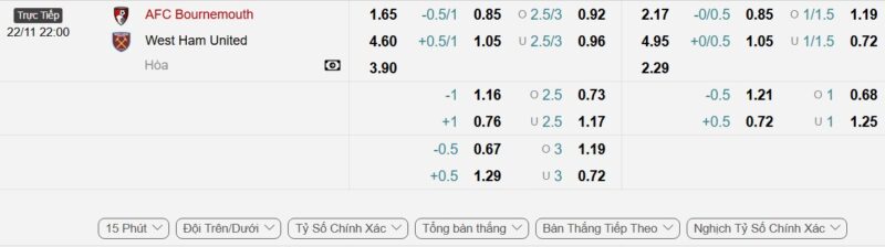 Bảng Tỷ lệ kèo bóng đá Bournemouth vs West Ham United