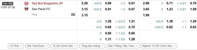 Bảng Tỷ lệ kèo bóng đá Red Bull Bragantino vs São Paulo