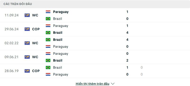 Thống kê phong độ gần đây Brazil vs Paraguay