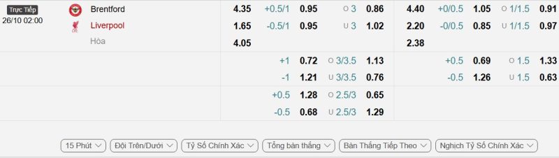 • Kèo tỷ số bóng đá hiệp 1: Brentford 1-1 Liverpool