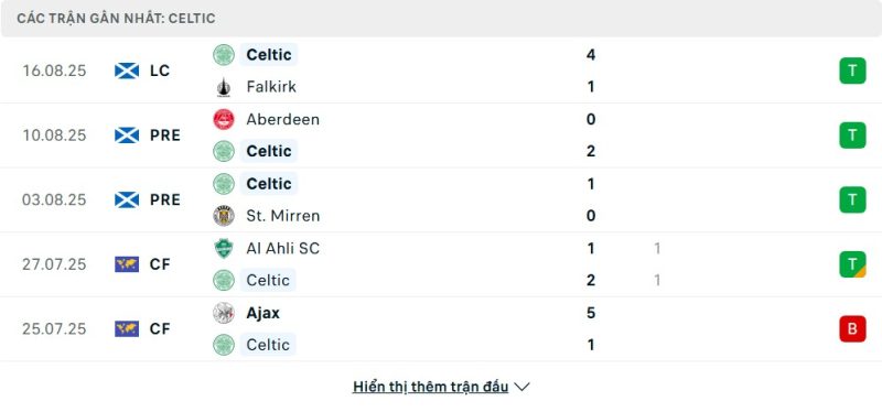 5 trận gần nhất của Celtic: W-W-W-D-L