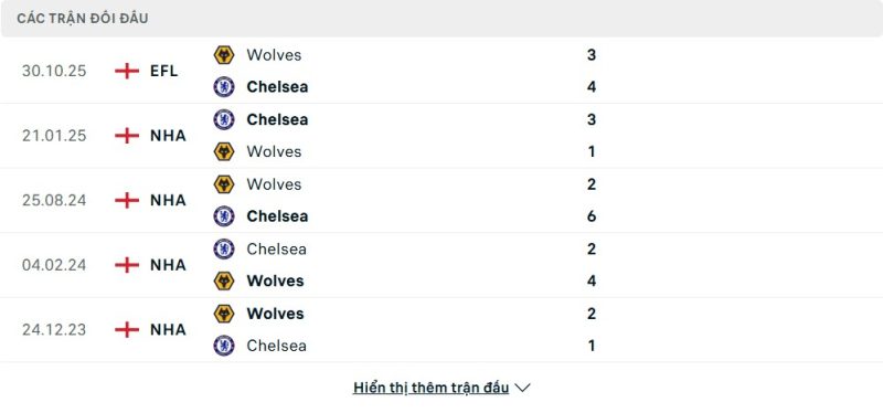 Thành tích đối đầu của Chelsea vs Wolverhampton Wanderers