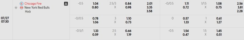 Bảng Tỷ lệ kèo bóng đá Chicago Fire vs New York Red Bulls