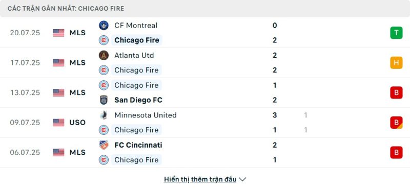 5 trận gần nhất của Chicago Fire: W-D-L-D-L