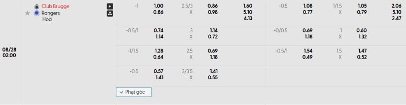 Bảng Tỷ lệ kèo bóng đá Club Brugge vs Rangers
