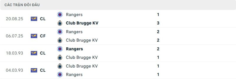 Thống kê phong độ gần đây Club Brugge vs Rangers