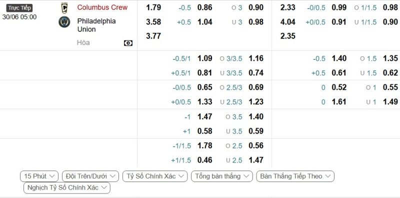 • Kèo tỷ số bóng đá hiệp 1: Columbus Crew 1-1 Philadelphia Union
