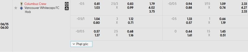 Bảng Tỷ lệ kèo bóng đá Columbus Crew vs Vancouver Whitecaps