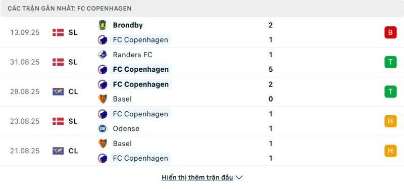 5 trận gần nhất của Copenhagen: L-W-W-D-D