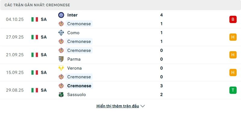 5 trận gần nhất của Cremonese: L-D-D-D-W