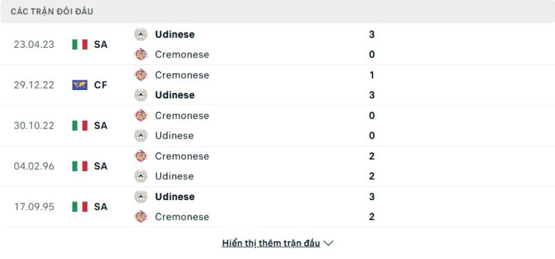 Thống kê phong độ gần đây Cremonese vs Udinese