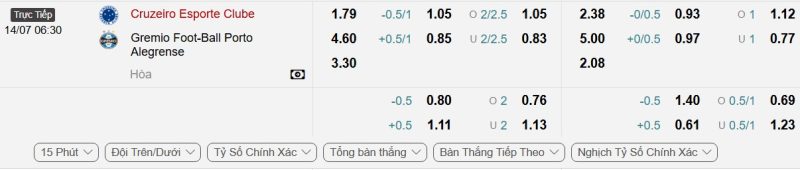 Bảng Tỷ lệ kèo bóng đá Cruzeiro vs Grêmio