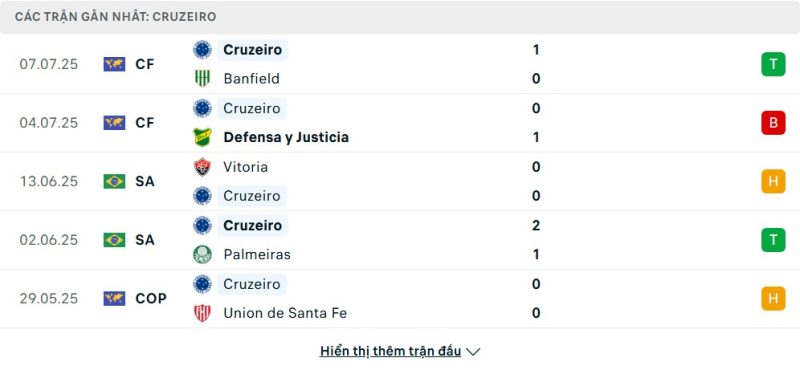 5 trận gần nhất của Cruzeiro: W-L-D-W-D