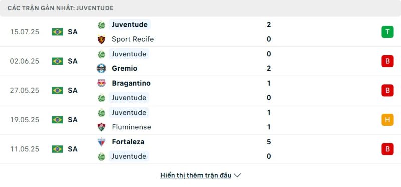 5 trận gần nhất của Juventude: W-L-L-D-L