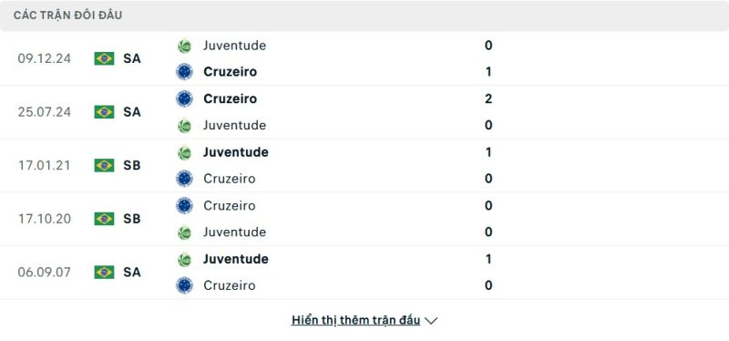 Thành tích đối đầu của Cruzeiro vs Juventude