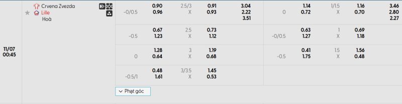 Bảng Tỷ lệ kèo bóng đá Crvena zvezda vs Lille