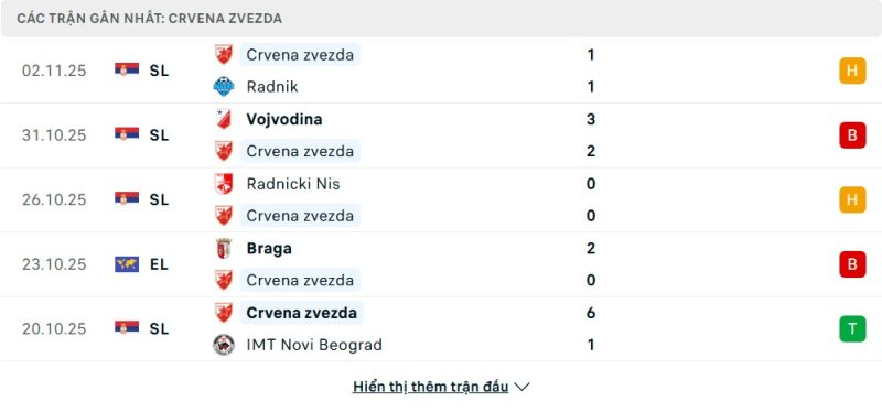 5 trận gần nhất của Crvena zvezda: D-L-D-L-W