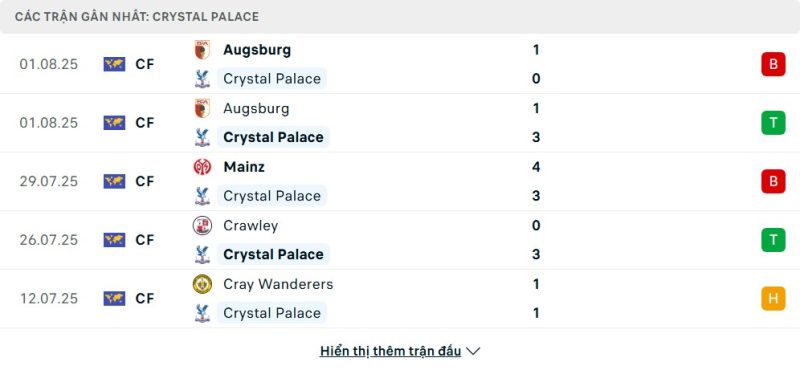 5 trận gần nhất của Crystal Palace: L-W-L-W-D