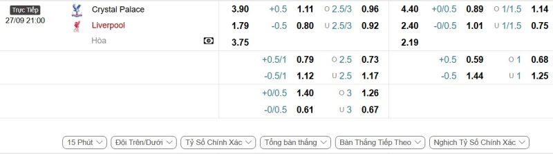 Bảng Tỷ lệ kèo bóng đá Crystal Palace vs Liverpool