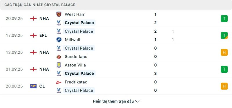 5 trận gần nhất của Crystal Palace: W-D-D-W-D