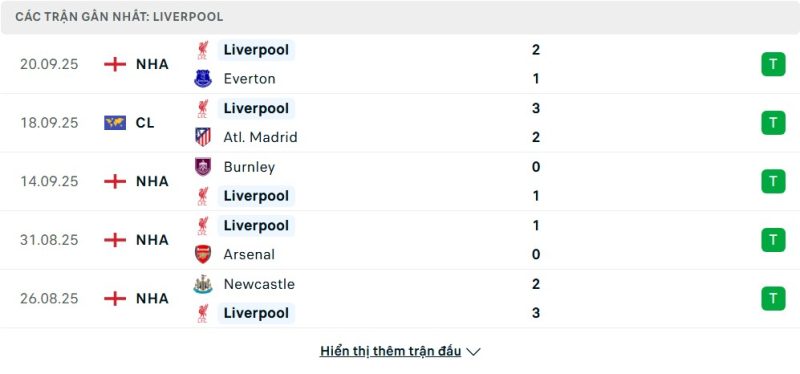 5 trận gần nhất của Liverpool: W-W-W-W-W