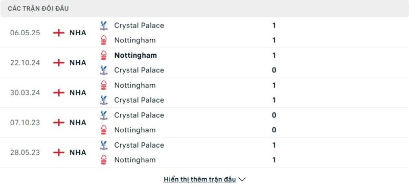 Thành tích đối đầu của Crystal Palace vs Nottingham Forest