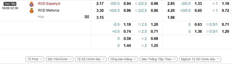 Bảng Tỷ lệ kèo bóng đá Espanyol vs Mallorca