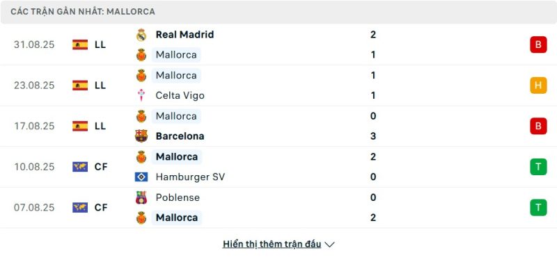 5 trận gần nhất của Mallorca: L-D-L-W-W