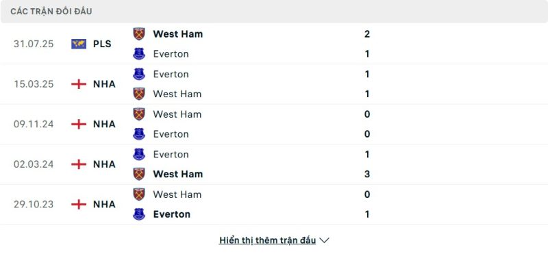 Thành tích đối đầu của Everton vs West Ham United