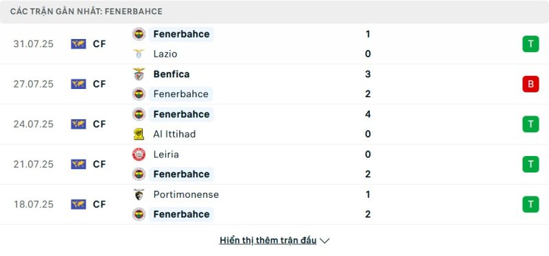 5 trận gần nhất của Fenerbahçe: W-L-W-W-W