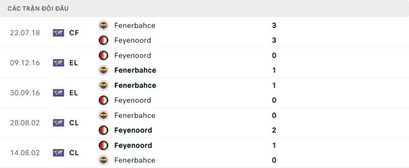 Thành tích đối đầu của Feyenoord vs Fenerbahçe